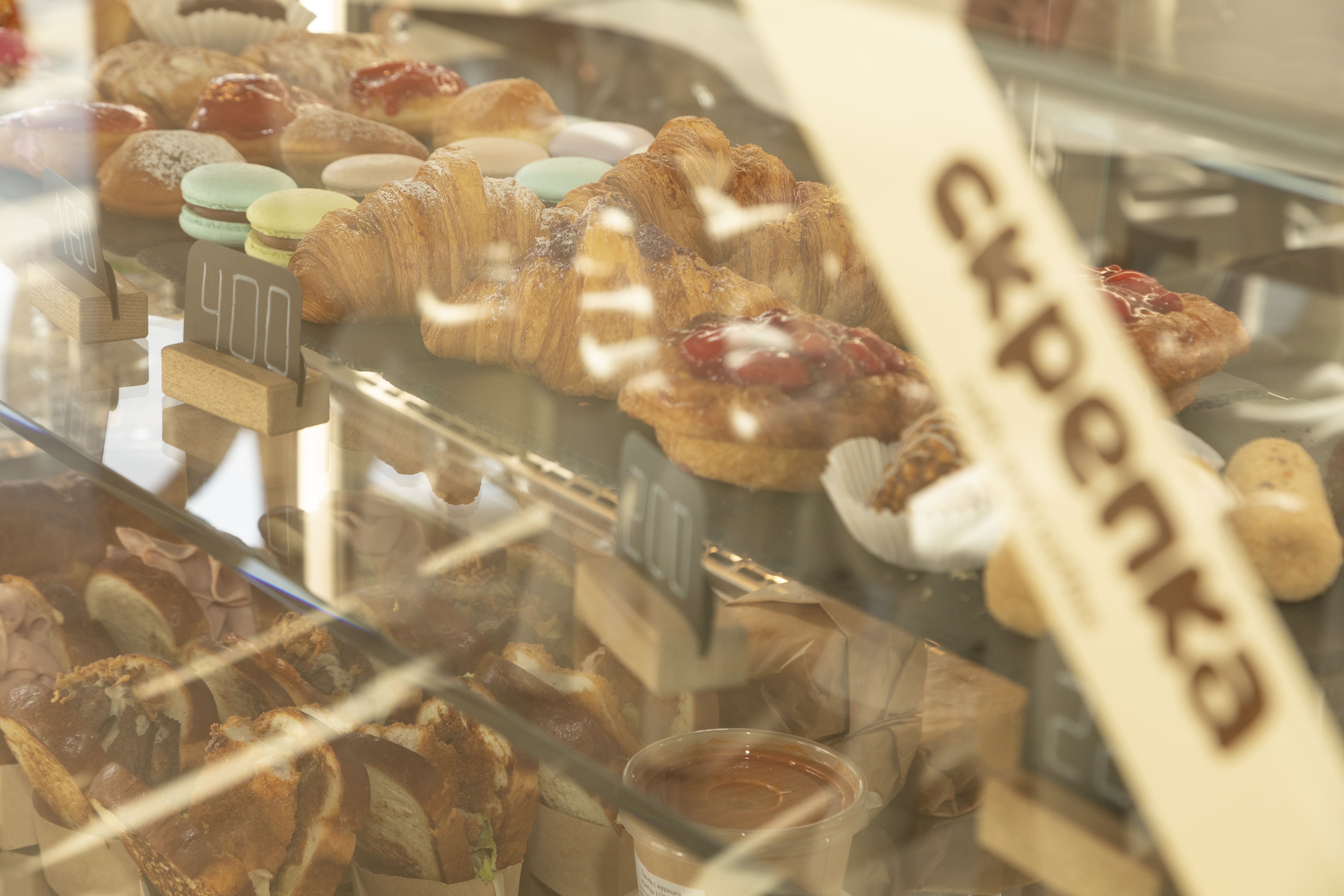 Кормят готовыми завтраками и обедами, сэндвичами, салатами и закусками, поят — классическим и альтернативным кофе, а также чаем, матчей, авторскими холодными напитками. Есть выпечка и десерты.